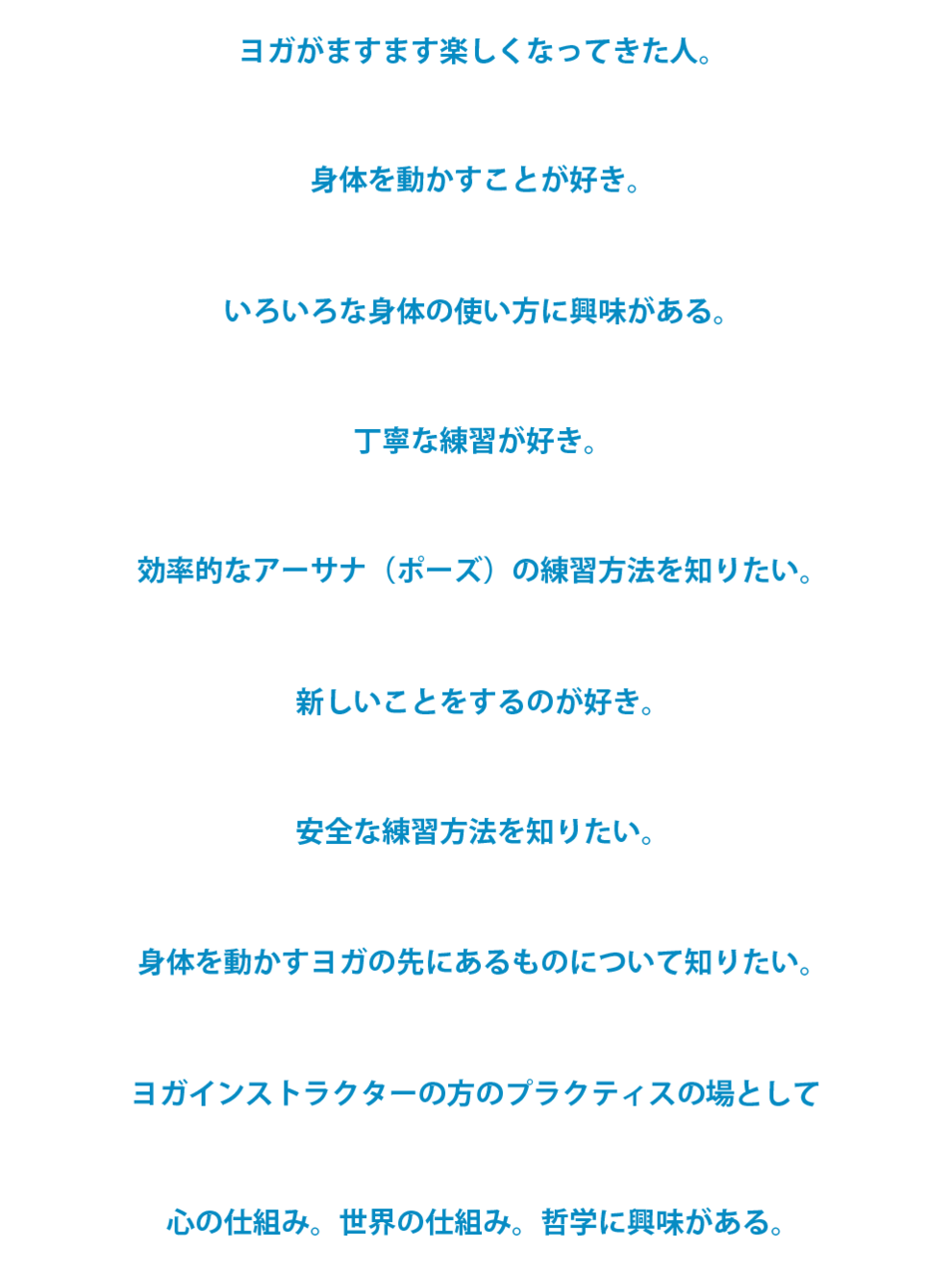 毎回のクラスにはハートテーマがあり、ヨガで得た経験が、マットの上だけに限らずマットを離れても人生に活かされるところが特徴です。